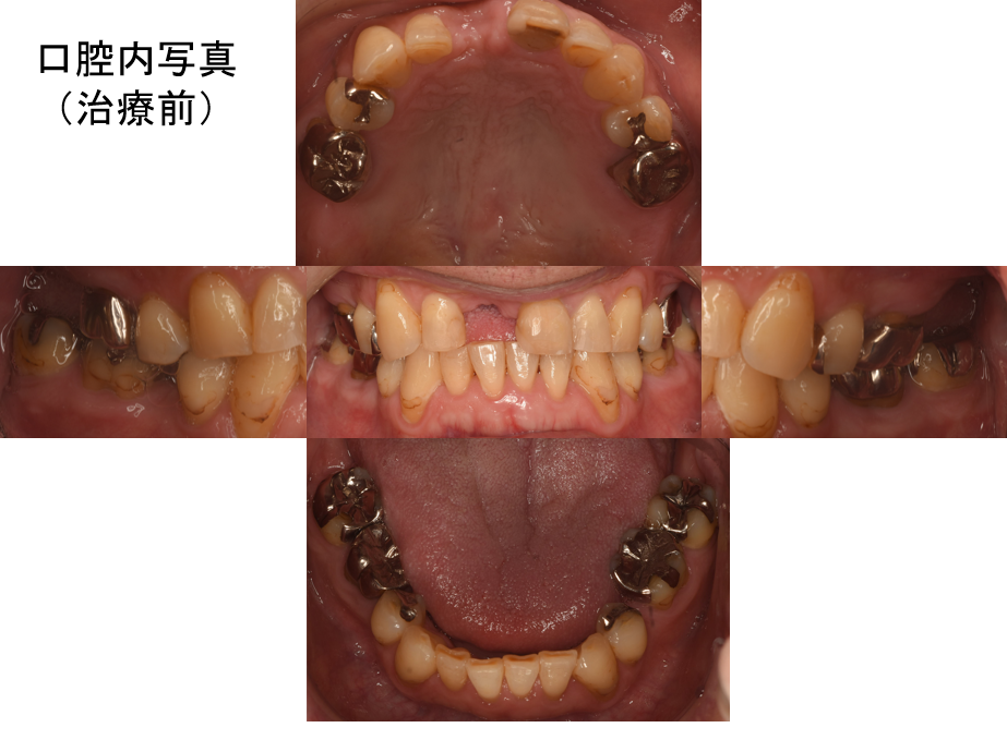前歯部の欠損以外は、軽度の歯周疾患があり、噛み合わせも深く顎の力も強いことで奥歯にもヒビがはいっていました。